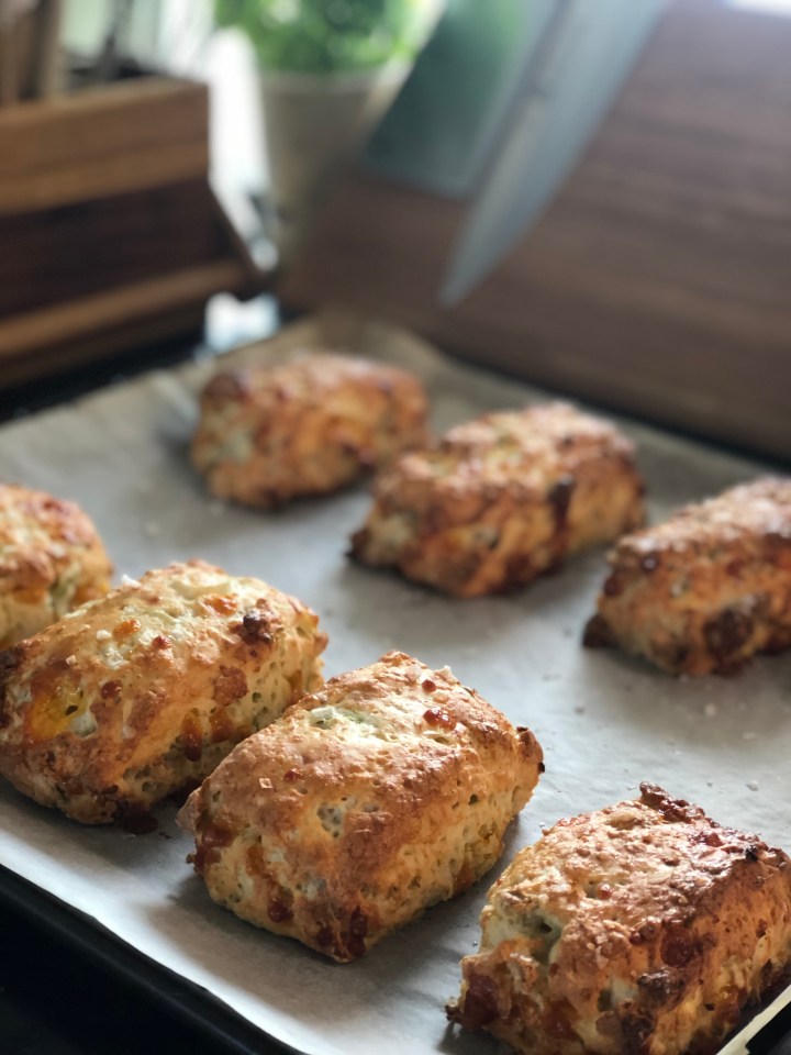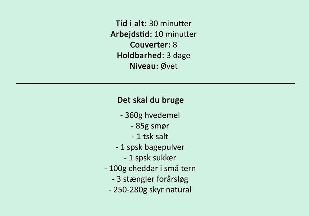Dog spises en biscuit ikke som dessert eller snack, men som et måltid. Derfor har jeg også fyret både forårsløg og cheddar i denne virkelig lækre opskrift. Spis den som bolle med pålæg, eller som tilbehør til en god salat.