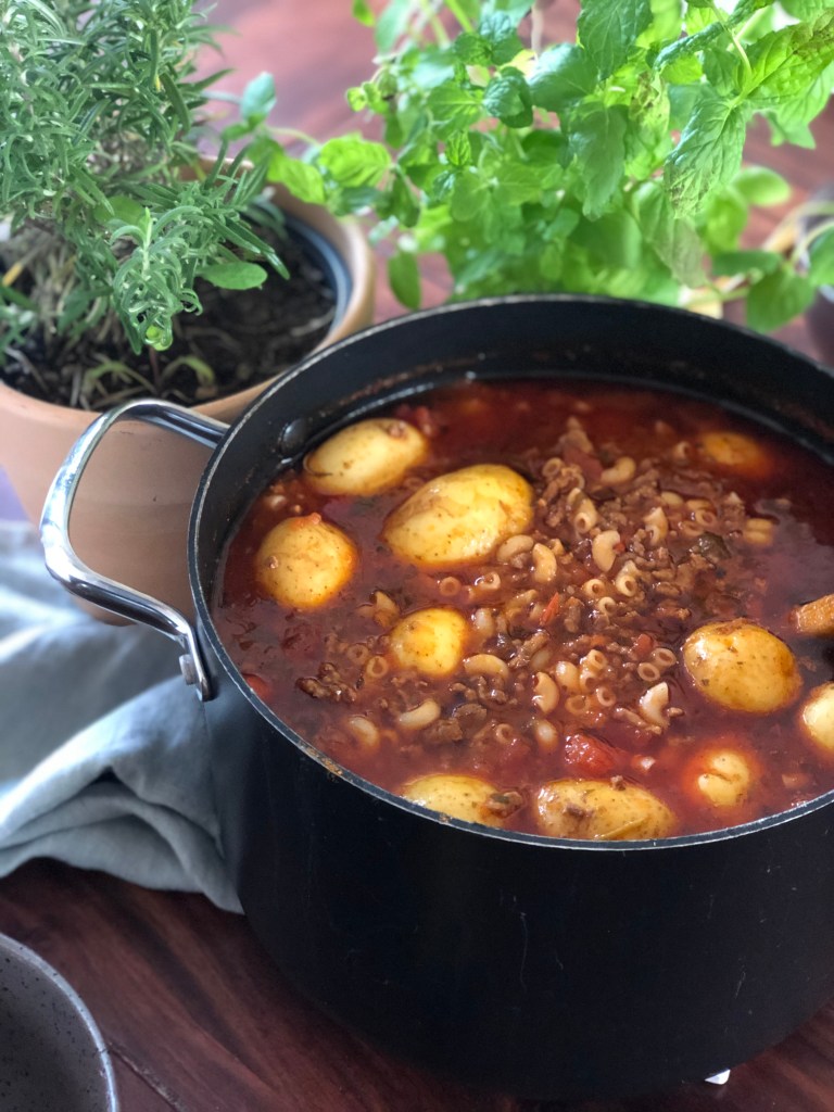 En god fyldig suppe med lækre, friske krydderier, mørt oksekød og gode, komplekse kulhydrater.