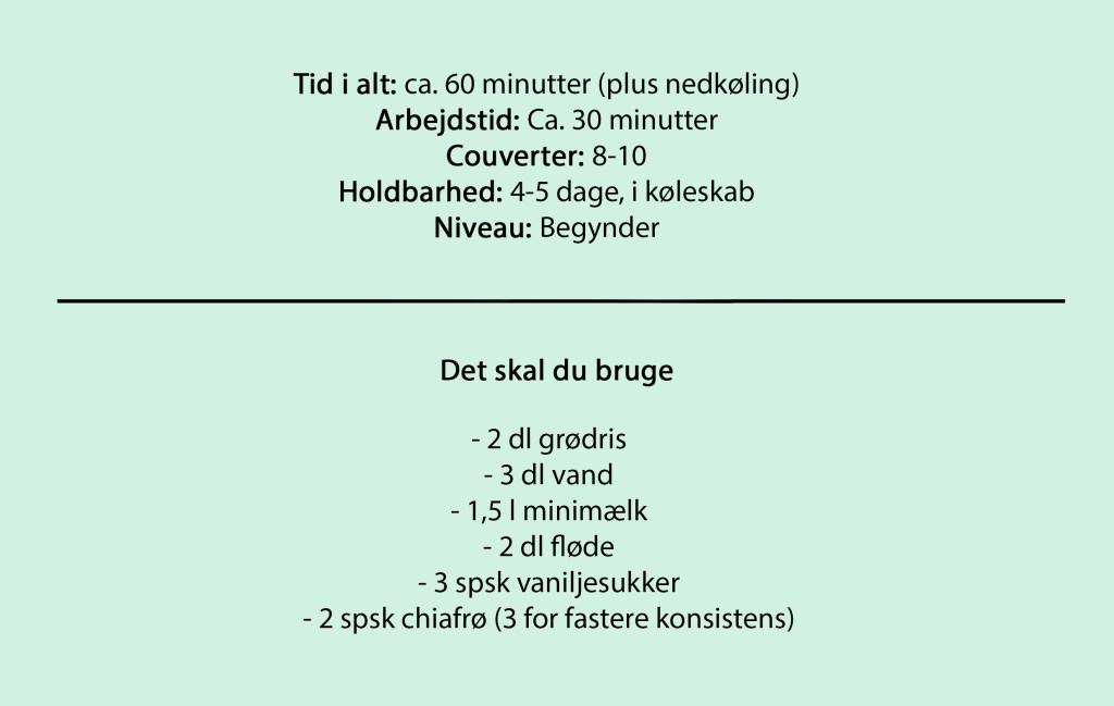Hæld ris og vand i en god gryde og bring i kog. Når risene har suget vandet, hældes mælk, fløde og vaniljesukker i gryden. Bring i kog endnu engang, skru herefter ned for blusset og lad det hele simre, indtil risene er kogt helt bløde. Husk at røre i grøden med jævne mellemrum, så den ikke brænder på.