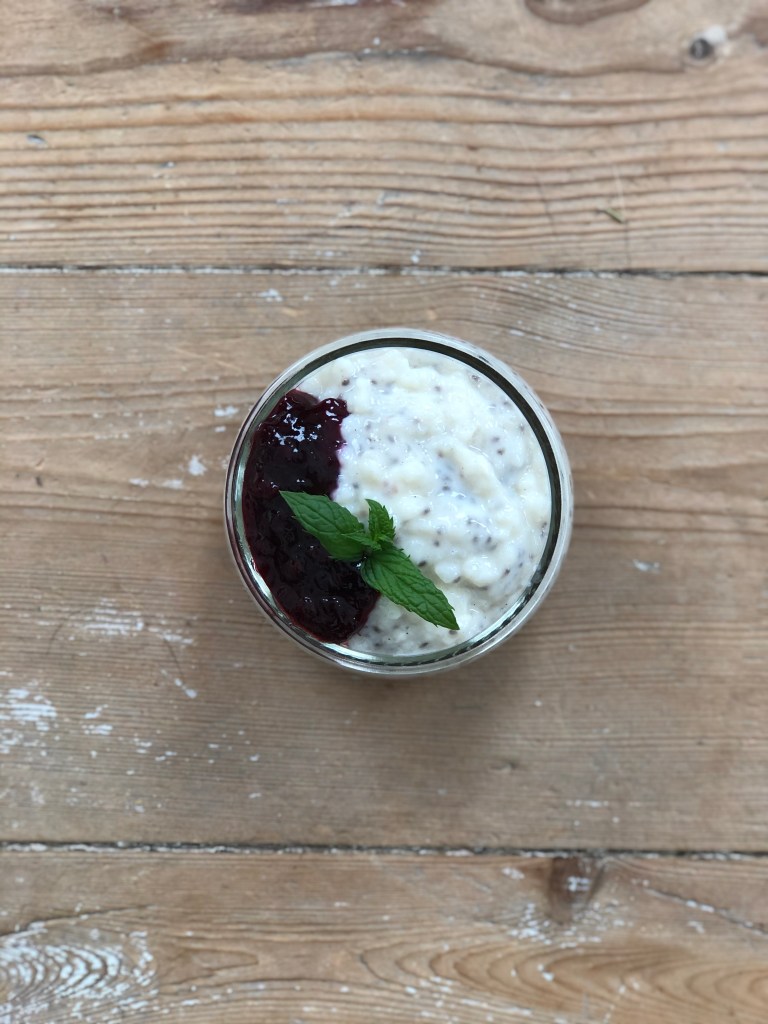 Kom 2,5 spsk grød i et portionsglas, samt 1 toppet tsk valgfri syltetøj. Jeg kan godt lide boysenbær–men både hindbær, jordbær og appelsin er lækkert til! Du kan også tilføje lidt müsli, ristet kokos, eller hvad du ellers elsker til morgenmad og snack.