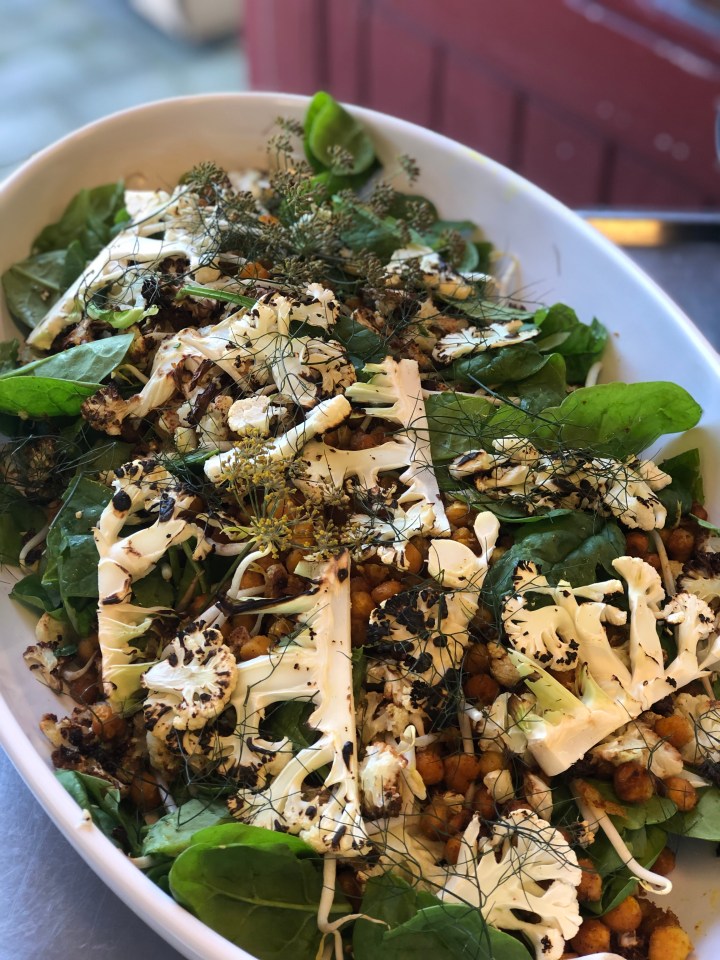 Dræn dine kikærter, og skær din blomkål ud i store skiver på ca. 1/2 cm i tykkelsen. Skræl og skær din sweet potato i tern, på ca. 1×1 cm.