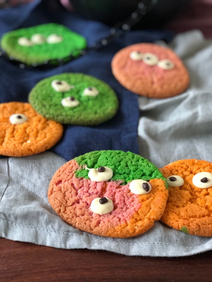 Farverige cookie monstre med chokoladeøjne.