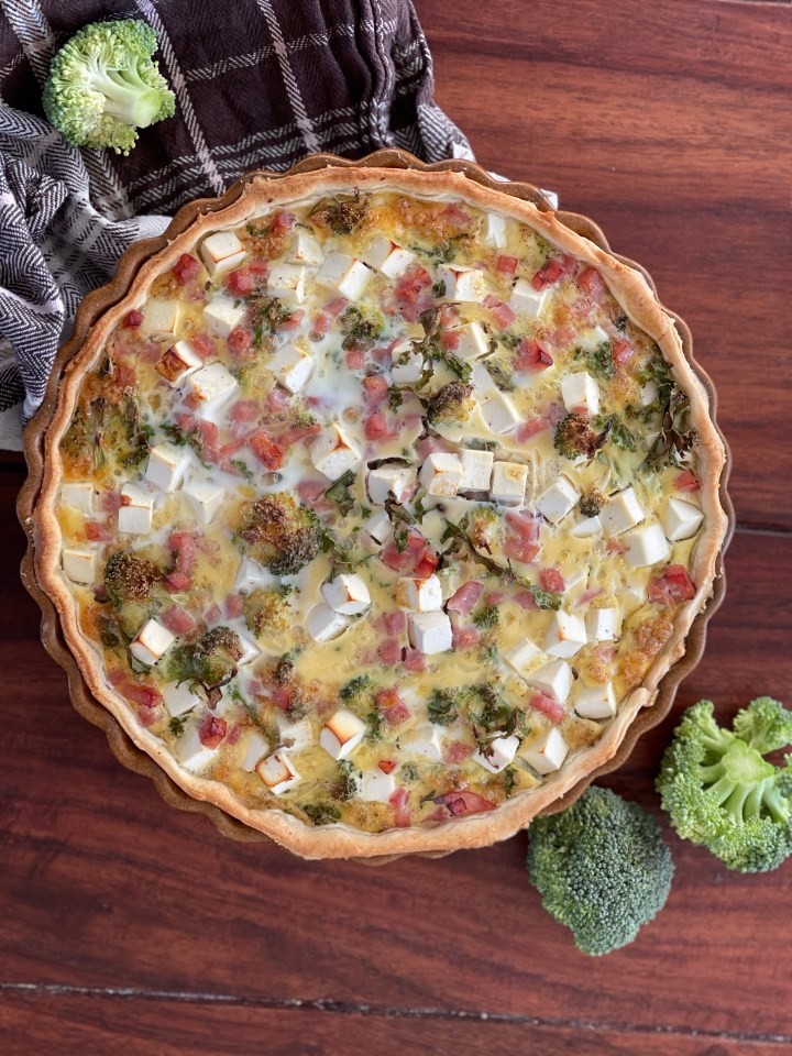 Vask og skær/bræk dit halve broccolihoved ud i små buketter. Læg dem så de dækker hele din tærtebund, og drys derefter en håndfuld hakket grønkål henover. Tilføj feta og skinke, og sæt til side. Hvis du ønsker en vegetarisk–og mindst lige så god–version af tærten, kan du udelade skinketern.